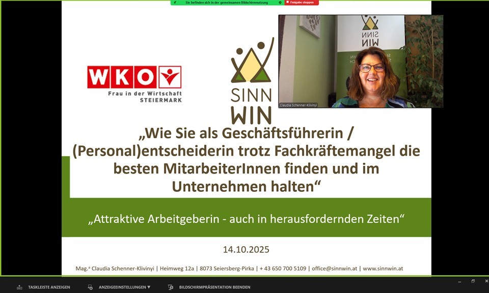 Auf Einladung von "Frau in der Wirtschaft" hielt Frau Mag.a Claudia Schenner-Klivinyi von SinnWin am 14.10.2025, einen online Vortrag zum Thema "Erfolgreiches Mitarbeiter finden u halten - erfolgreiches Employer Branding"