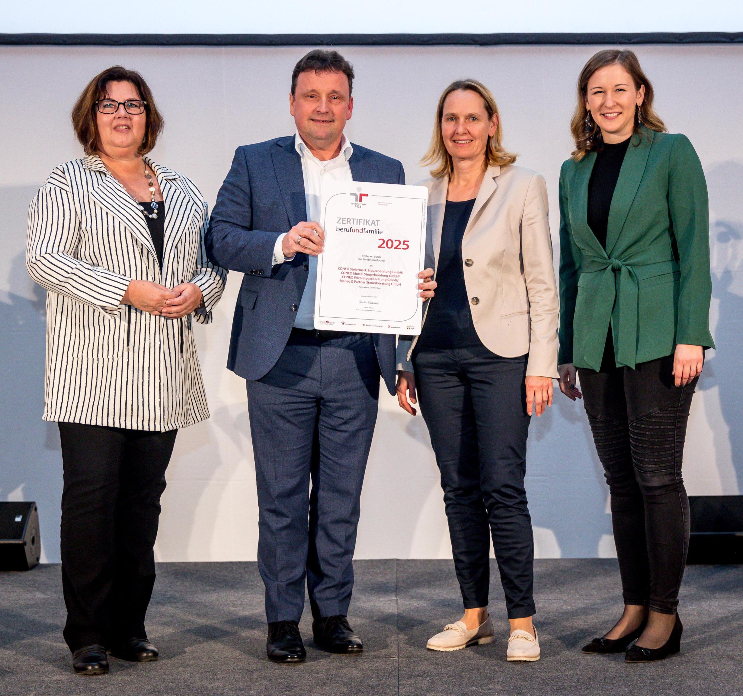 Am 14.11.2025 verlieh Familienministerin Claudia Plakolm CONEO Steuerberatung, nach erfolgreicher externer Begutachtung, zum 2. Mal die staatliche Auszeichung "Familienfreundlicher Arbeitgeber".